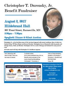 Cash or Check donations payable to Christopher T Durensky, Jr. Benefit can be made at Bell Bank in Fargo.